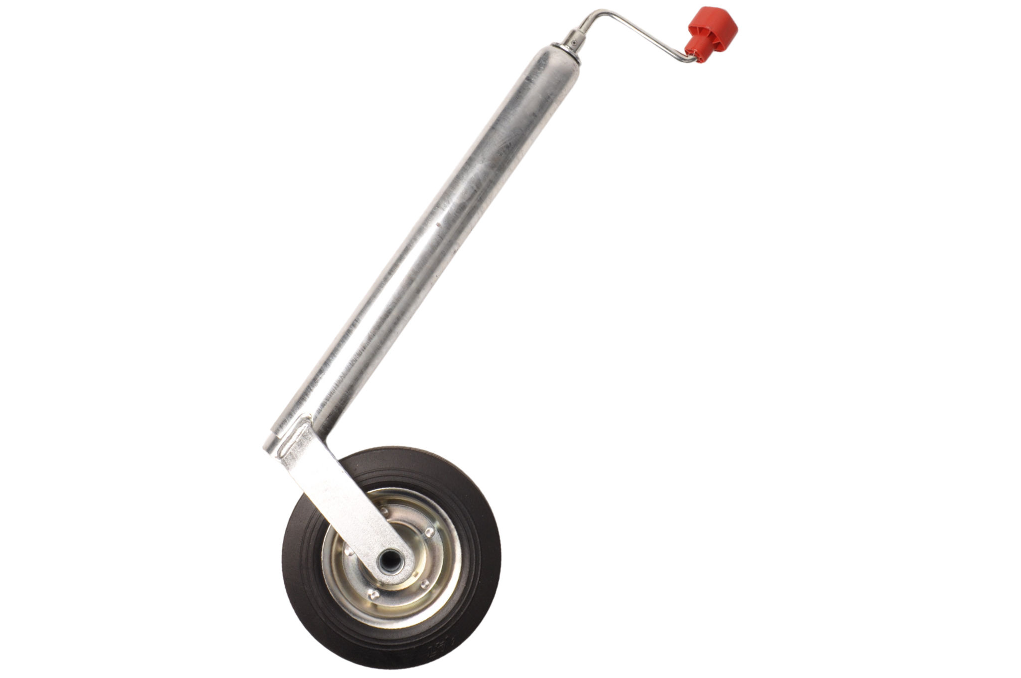 Alko Stützradverlängert mit Stahlfelge und Vollgummireifen. Leichter Kurbelantrieb durch eingebautes Axiallager. Verlängerte Version mit einer Höhe von 550 mm (eingedreht, unterer Reifen bis zum Beginn der Kurbel).
