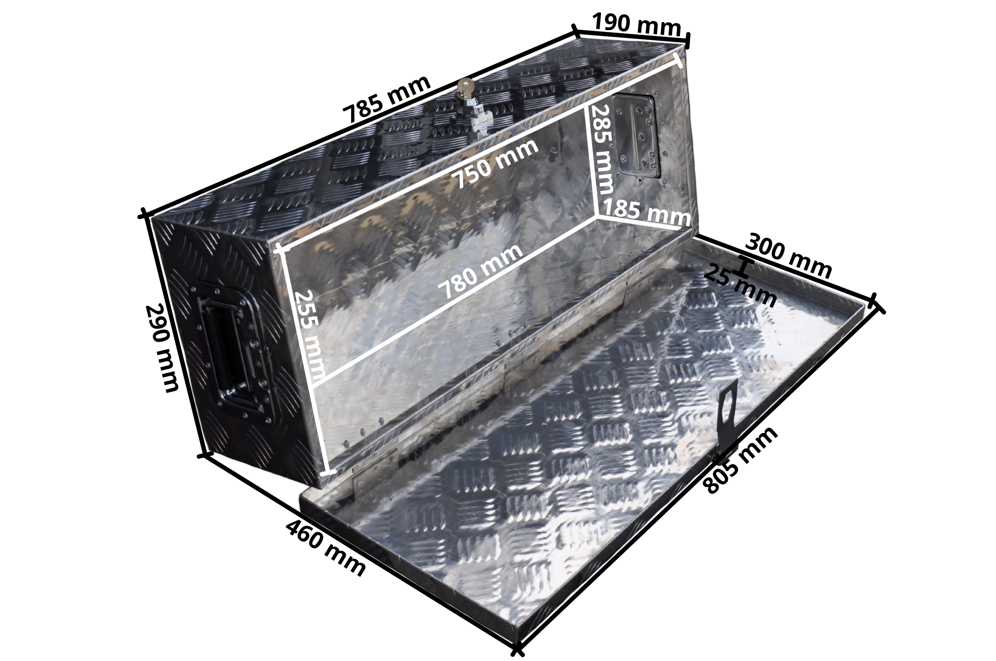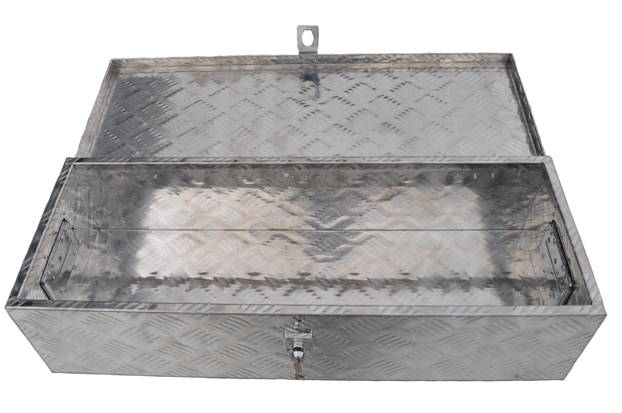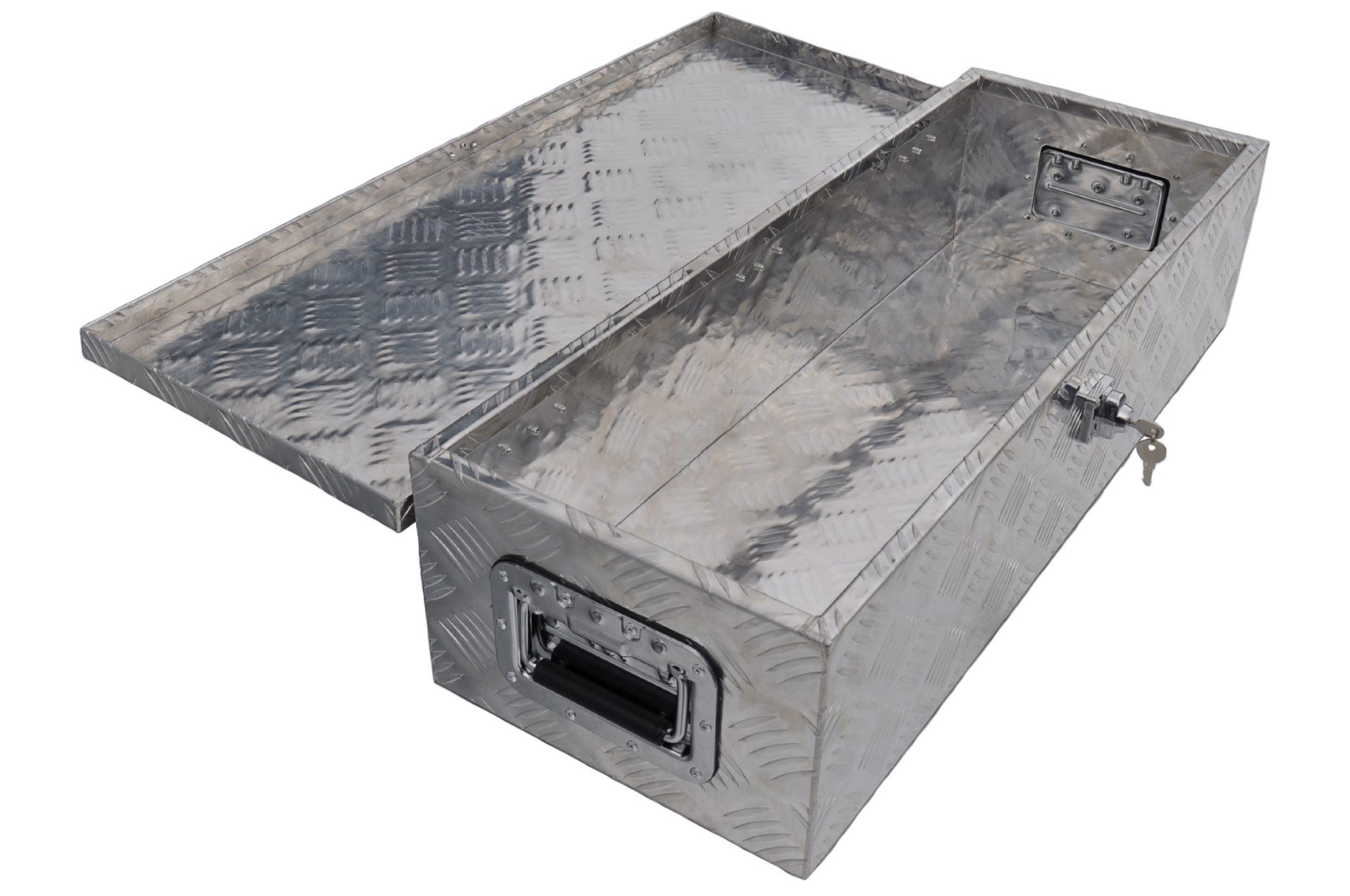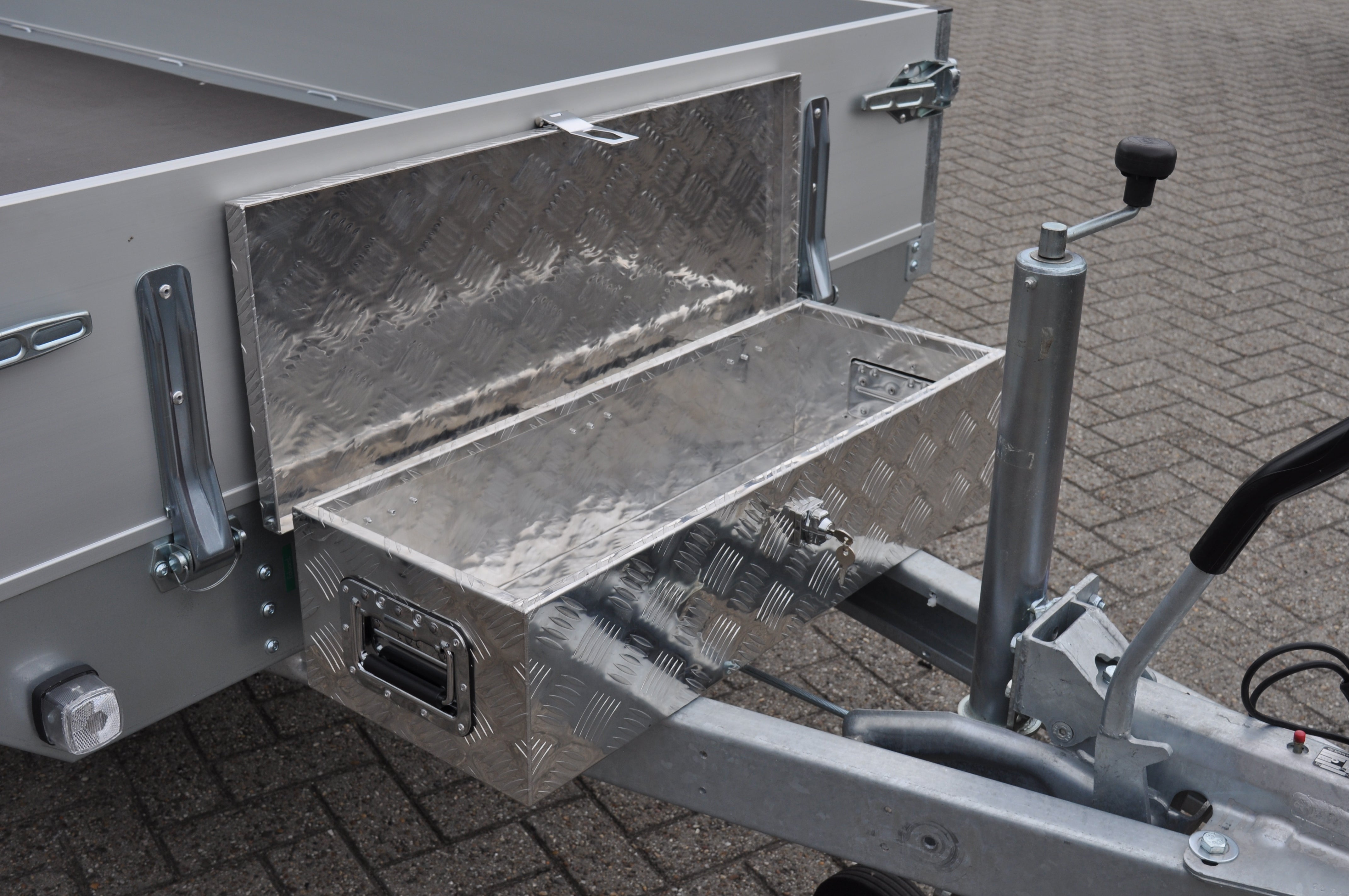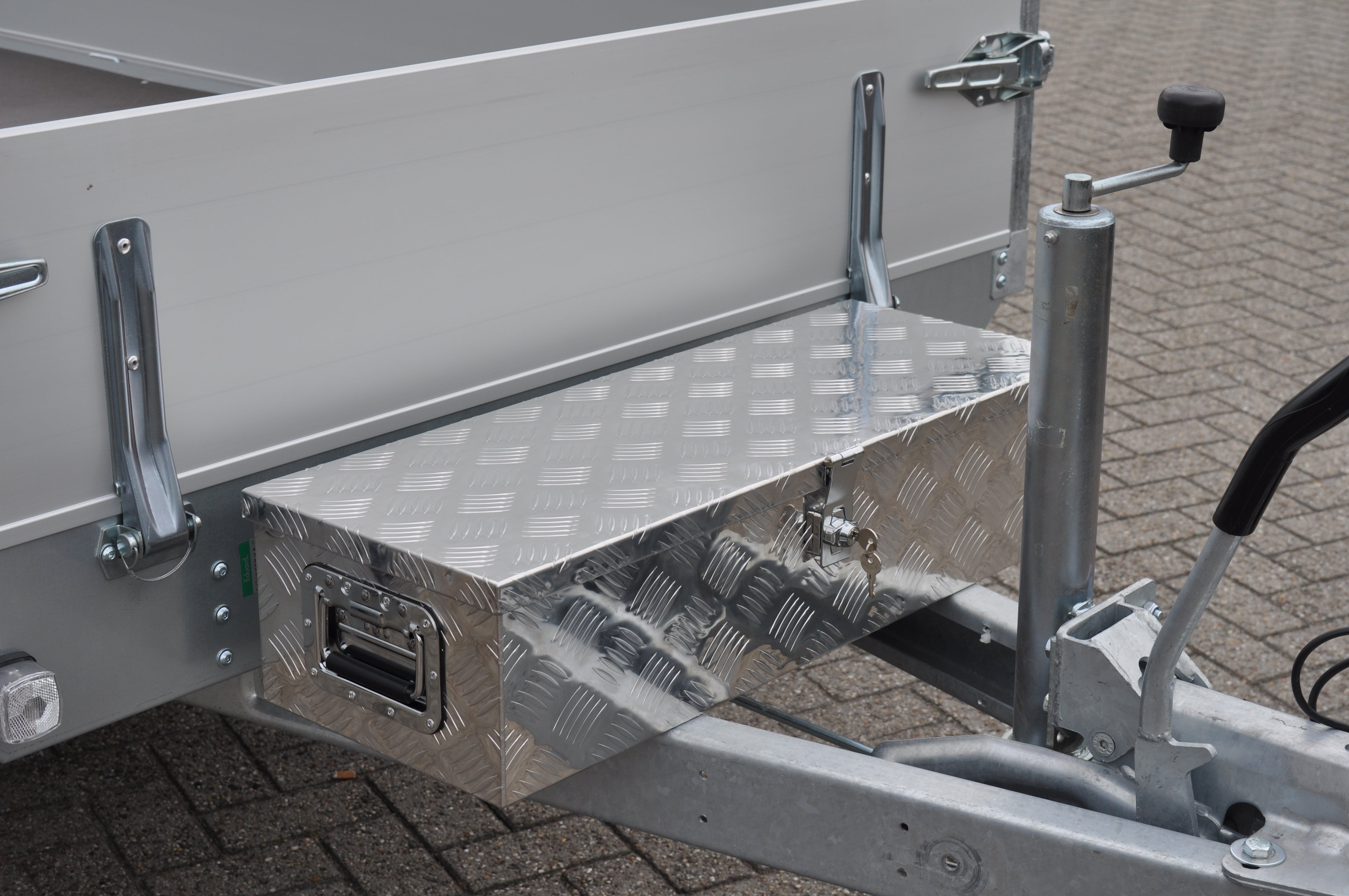 Diese Deichselbox aus Aluminium-Riffelblech ist ideal für die sichere Aufbewahrung und den Transport von Werkzeug oder losen Teilen auf dem Anhänger. Dank des kompakten Designs auch als Werkzeugkiste verwendbar.