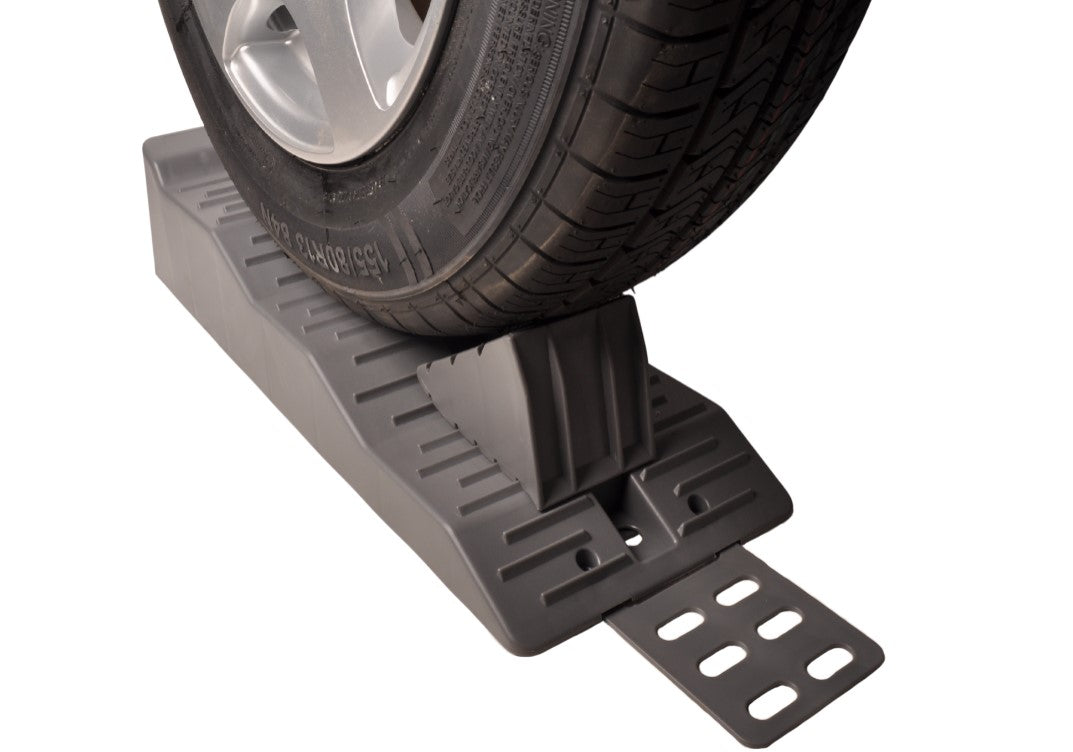 Die Auffahrkeile helfen dabei, den Höhenunterschied zwischen den Rädern auszugleichen. Sie fahren mit den Rädern langsam auf die Keile, bis das Fahrzeug waagerecht steht. Die Antirutschplatten sorgen für zusätzlichen Halt, damit die Keile auf nassem Gras, Sand oder Kies nicht verrutschen. Mit den mitgelieferten Unterlegkeilen sichern Sie das Ganze zusätzlich, sodass das Fahrzeug nicht zurückrollen kann.