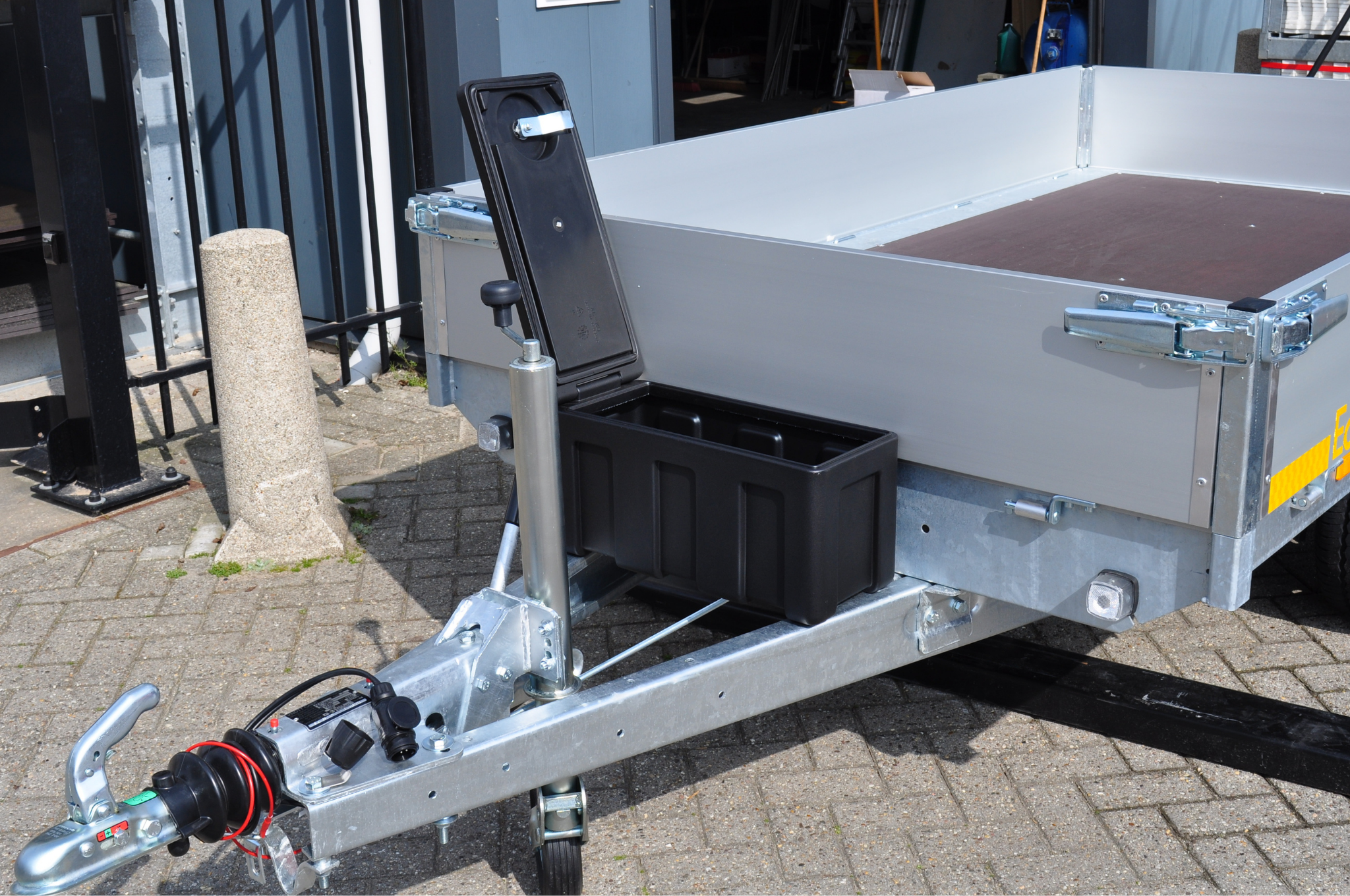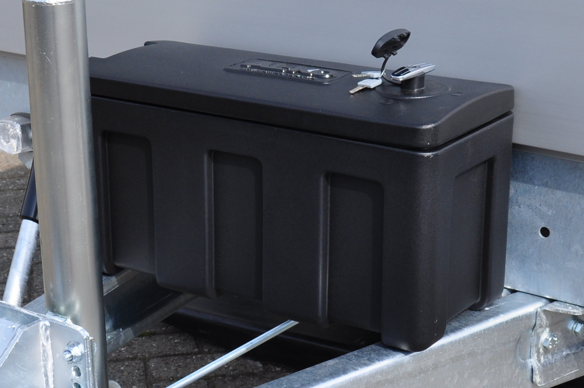 Praktische und vielseitige Deichselbox für die Anhängerdeichsel. Diese Box hat einen speziellen Deckel, der sich zur Seite hin öffnen lässt. So können Sie den Deckel ganz leicht öffnen, ohne dass er an die Frontplatte Ihres Anhängers stößt.
