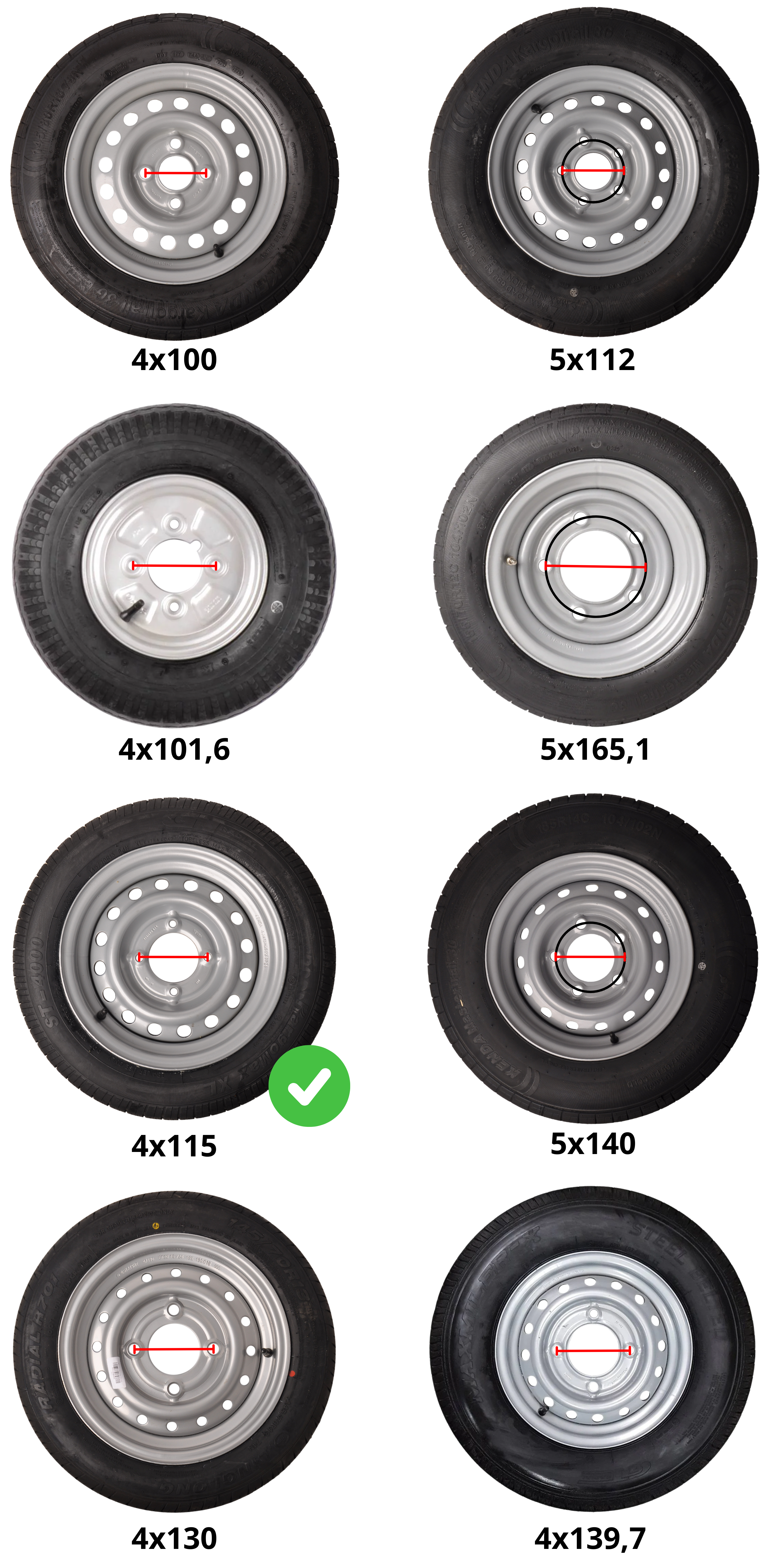 Dieses Komplettrad für 10-Zoll-Anhänger mit der Reifengröße 4.50 wird häufig bei Faltanhängern und kleinen Anhängern verwendet. Der Gesamtdurchmesser dieses Rades beträgt 48,6 cm und die Gesamtbreite 12,7 cm. Die Felge hat eine Teilung von 4x115 mm.